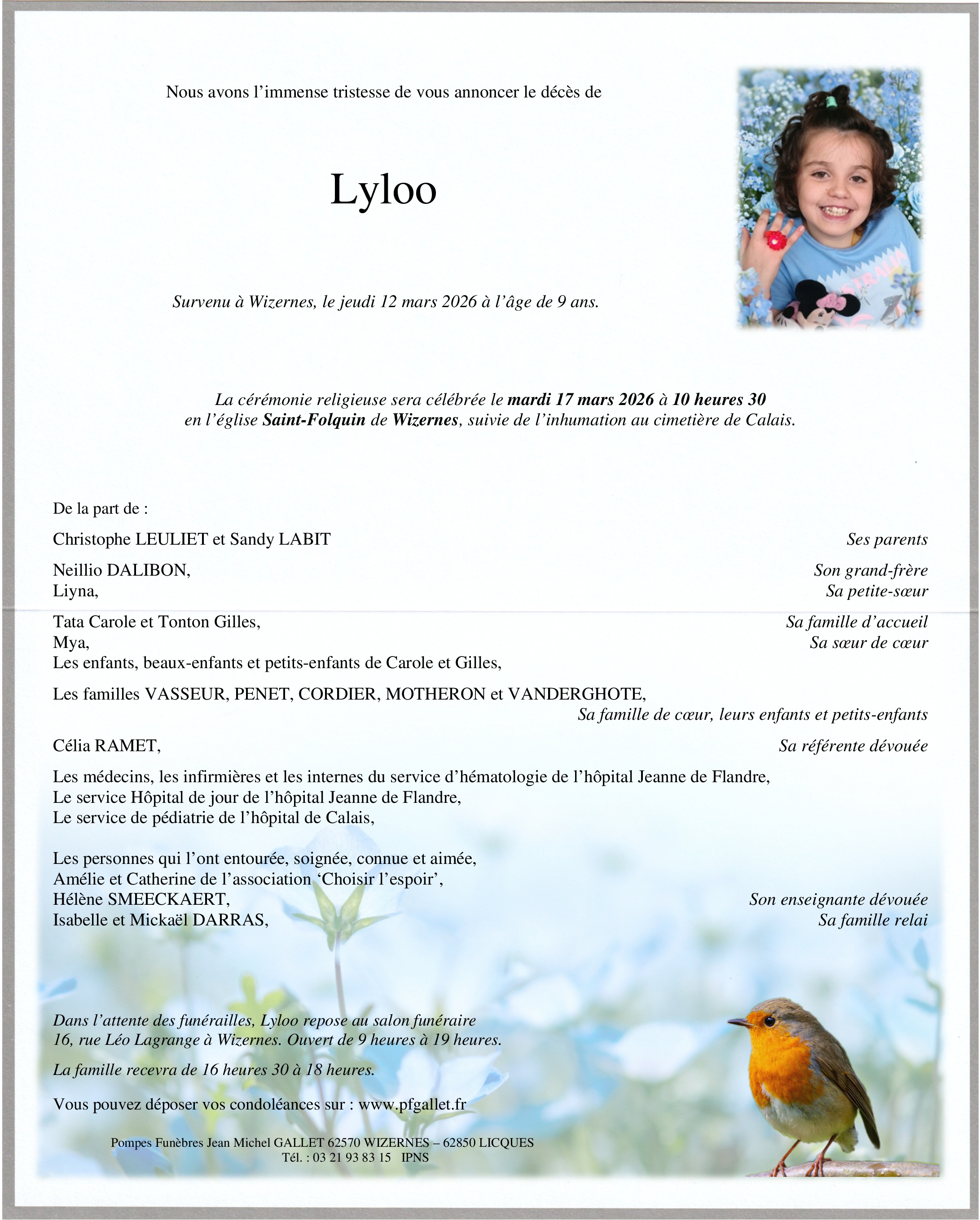 Rendez hommage à Lyloo et soutenez la famille en laissant un message ou en faisant livrer des fleurs à la cérémonie.