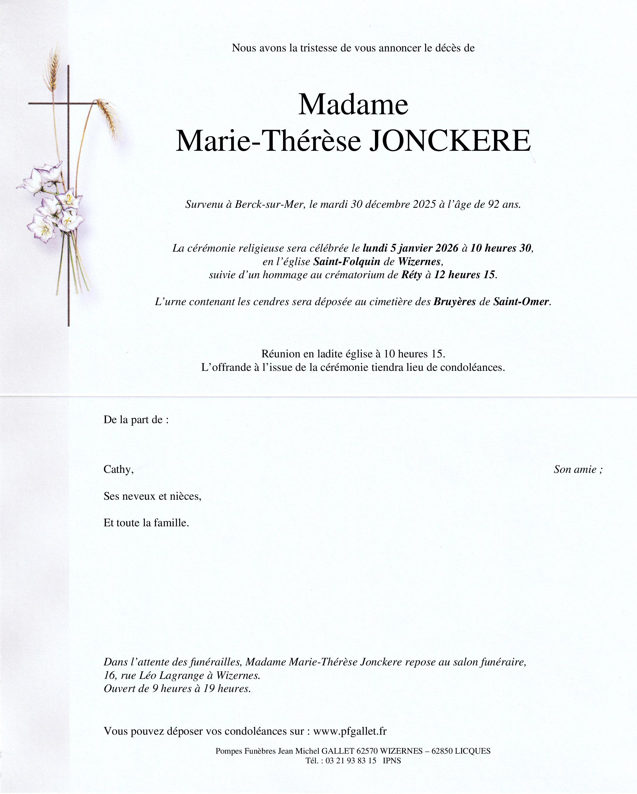 Avis de décès de Madame Marie-Thérèse JONCKERE