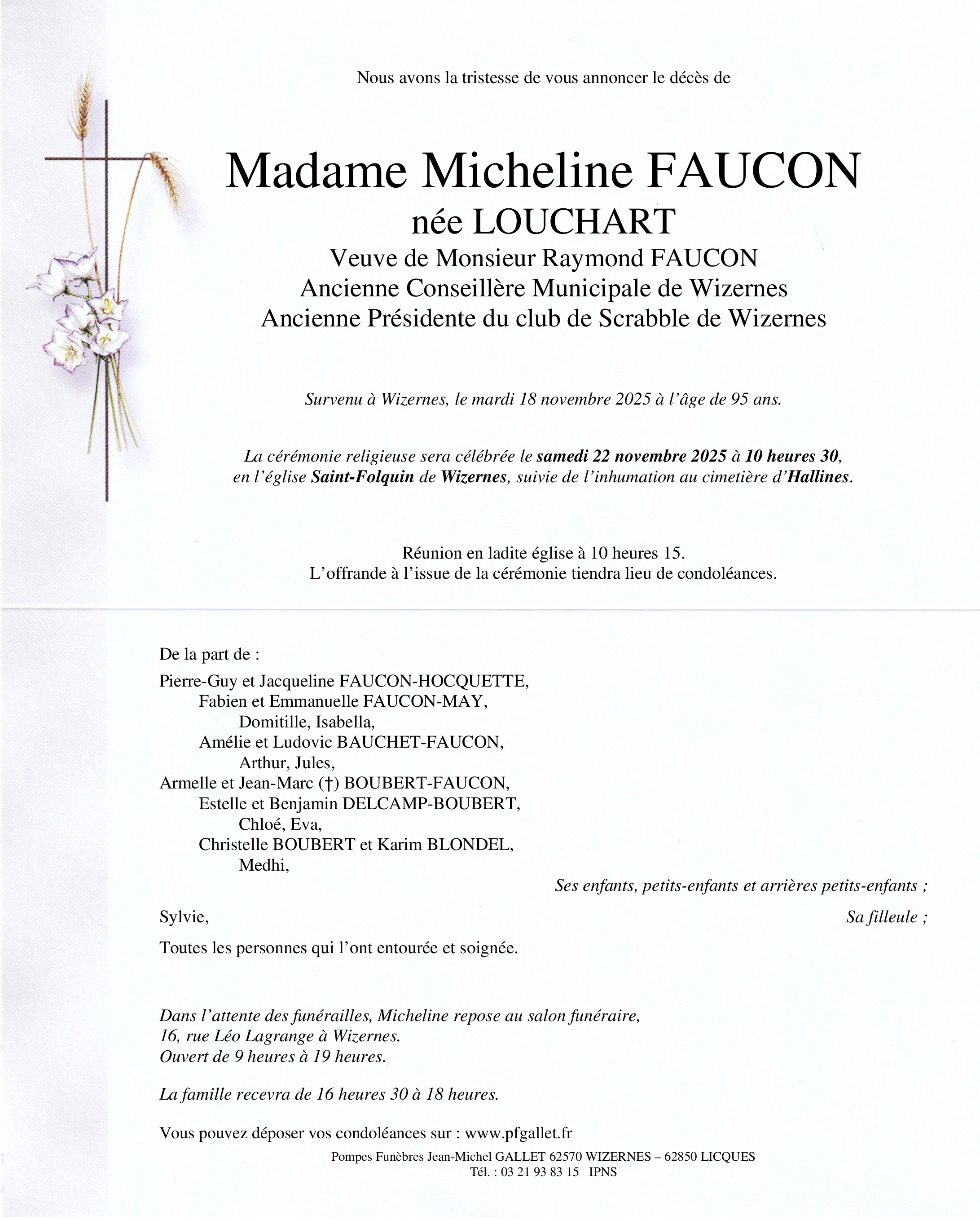 Déroulement des funérailles de Madame Micheline Faucon