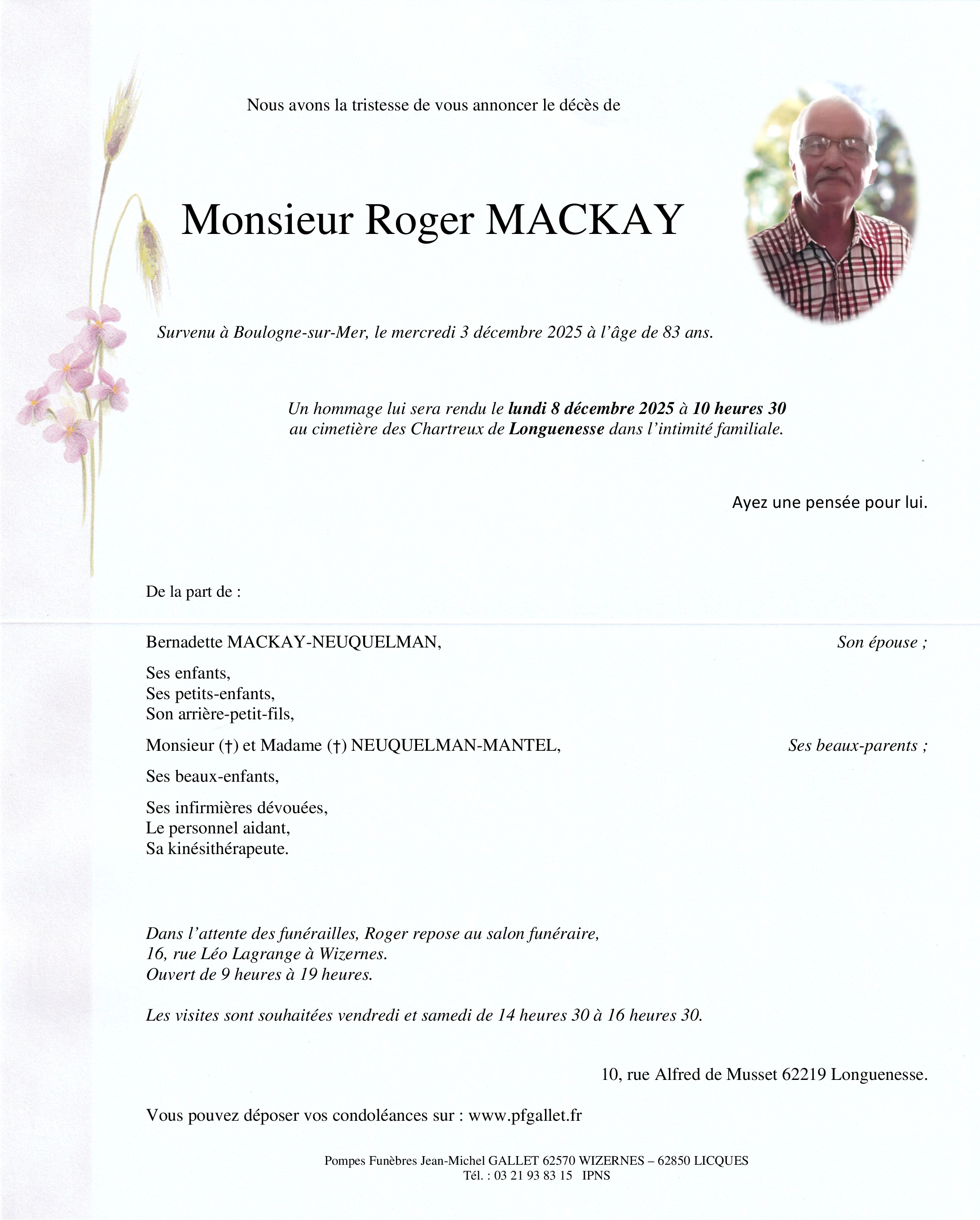 Cette page vous permet de présenter vos condoléances à la famille et de partager l'avis de décès de Roger.